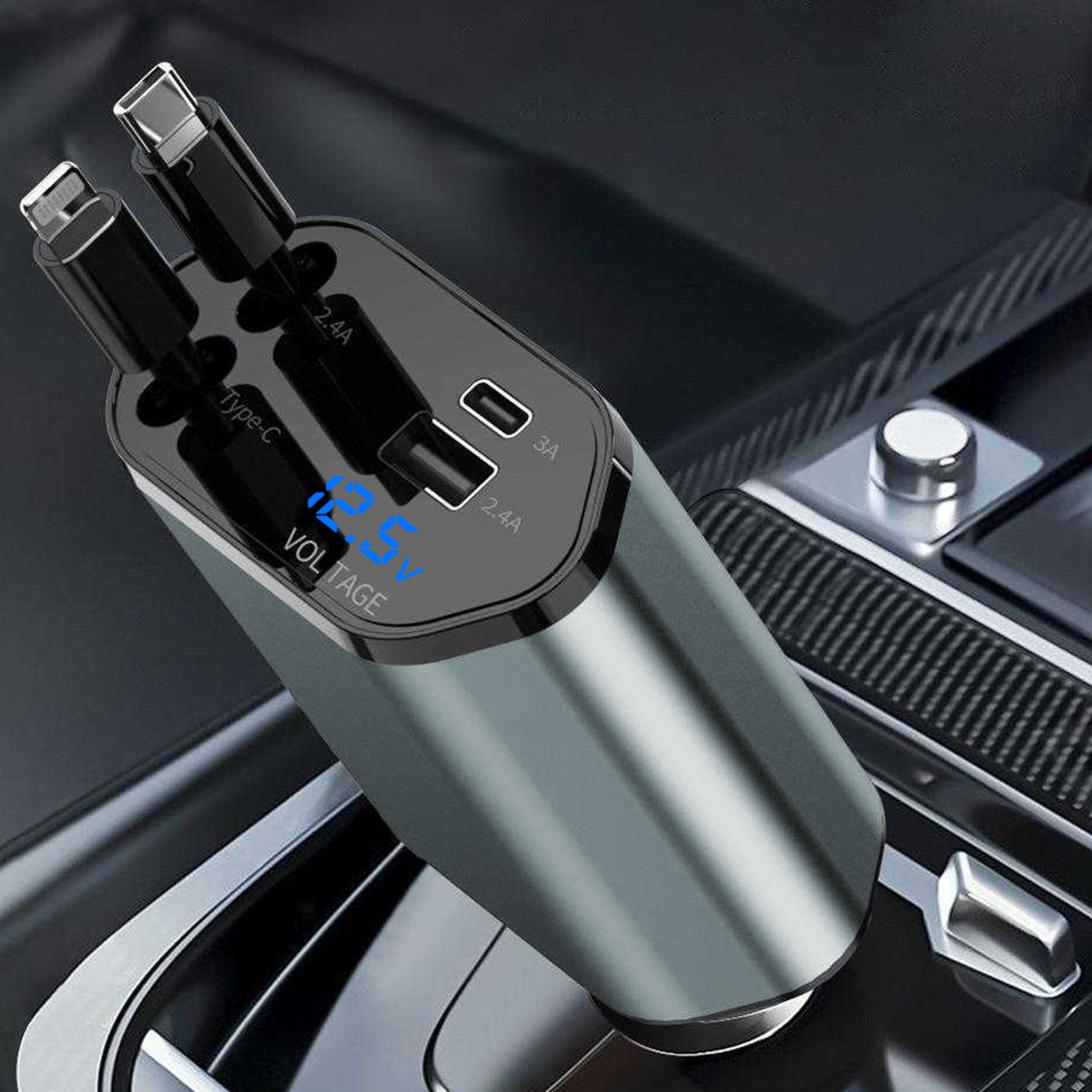 Tired of messy cables and slow charging in your car? Meet the Deep Air Grey 66W Car Charger – the ultimate all-in-one power solution designed for the modern driver. Engineered with premium materials and cutting-edge technology, this charger delivers blistering 66W fast charging to power up your devices at incredible speed. Its unique built-in retractable Type-C and Lightning cables eliminate clutter, while the intelligent digital display keeps you informed about your vehicle's voltage in real-time. Whether you're commuting, road-tripping, or using rideshare services, stay fully charged and organized.